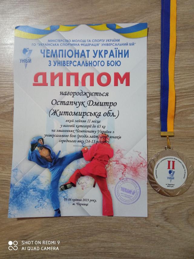 Остапчук Дмитро, учень 9 класу ліцею #10 м. Житомира зайняв ІІ місце на змаганнях у ЧЕМПІОНАТІ УКРАЇНИ з універсального бою. Пишаємося. Гордість Житомира. Гордість України💙💛