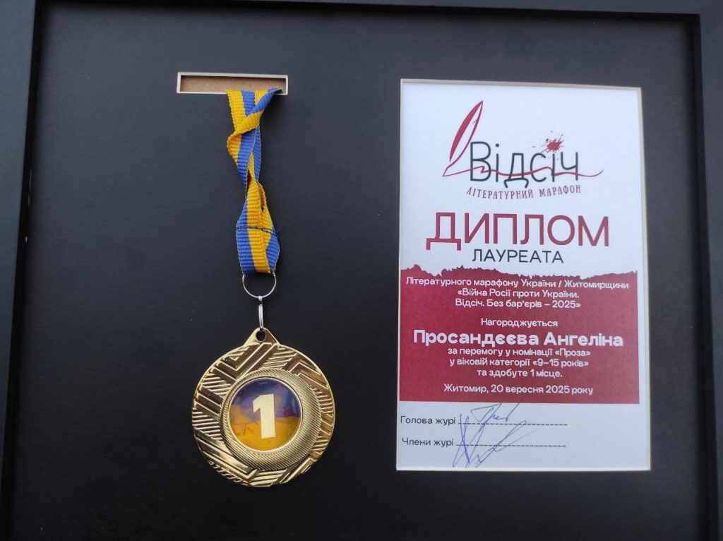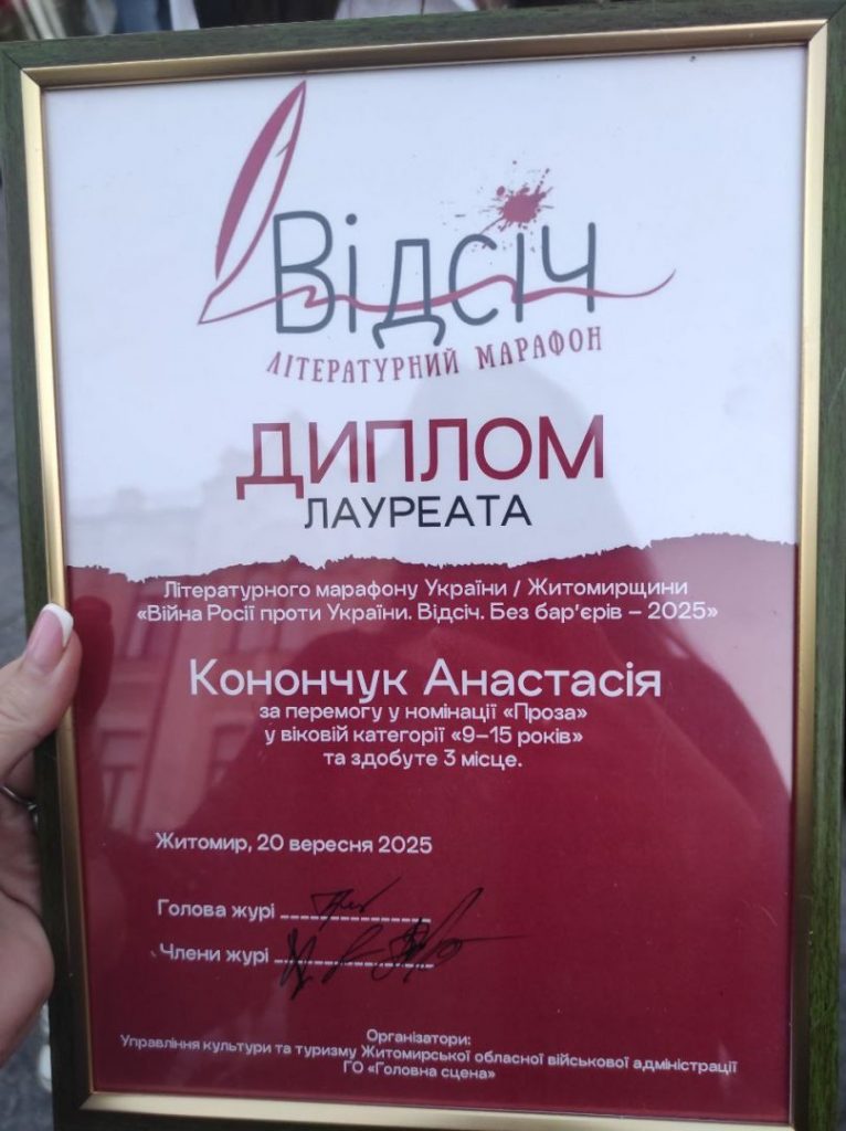 20-21 вересня в Житомирі проходив III Книжковий форум “Відсіч. Без бар’єрів”📚. До участі в ньому долучилися наші учні 3-4-х класів👍, які фантазували і створювали фантастичних героїв разом з дитячою письменницею Ланою Ра👍. Пишаємося тим, що двоє наших учениць Просандєєва Ангеліна (6-Б кл)⭐ та Конончук Анастасія (11 кл) ⭐ отримали нагороди за участь у літературному марафоні “Війна росії проти України. Відсіч. Без бар’єрів – 2025″👍. У номінації “Проза” (вікова категорія 9-15 років) дівчата здобули перше🥇 і третє🥉 місця👍. Щиро дякуємо вчительці української мови та літератури Семеній Нелі Михайлівні⭐, яка всю себе віддає дітям і надихає їх на творчість🖋️📚